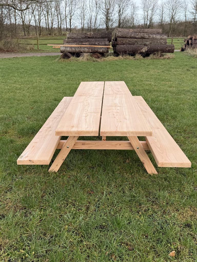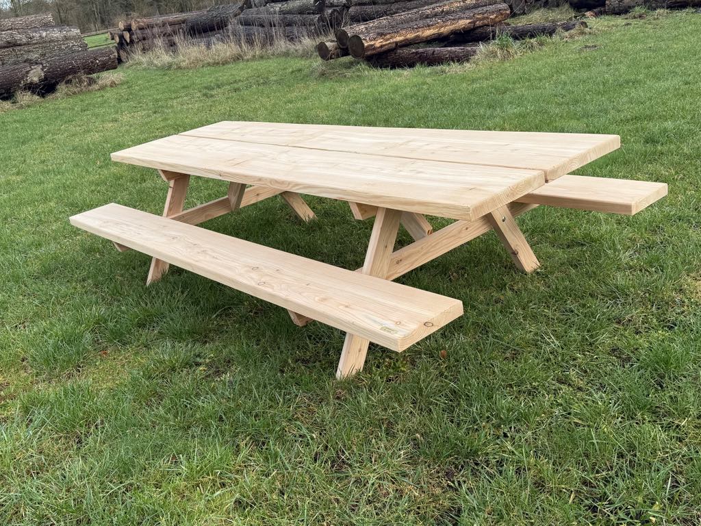 Stabilt bord og bænkesæt. Sættet er lavet at dansk kvalitets douglas træ der også anvendes til terrassebrædder. Bordsættet er 290 cm langt, 180 cm bredt, 105 cm i bord højden og med siddehøjde på 35 cm.